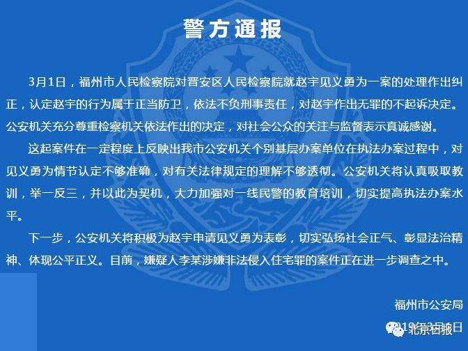 据福州公安官方微信消息,3月1日,福州市人民检察院对晋安区人民检察院就赵宇见义勇为一案的处理作出纠正,认定赵宇的行为属于正当防卫,依法不负刑事责任,对赵宇作出无罪的不起诉决定。公安机关充分尊重检察机关依法作出的决定,对社会公众的关注与监督表示真诚感谢。