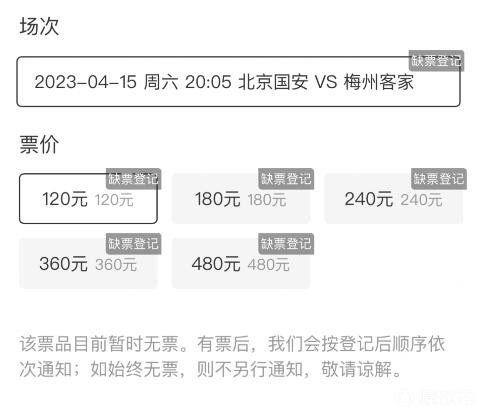 秒无!国安首轮主场散票,开售不到5分钟被抢购一空在国安新赛季首轮比赛正式开票后,不到5分钟就全部售罄。4月15日晚,国安将在新赛季首轮主场对阵梅州,此役单场票价为120元、180元、240元、360元、480元,今天上午11点正式起售。结果不到5分钟的时间,所有的散票均已售罄。