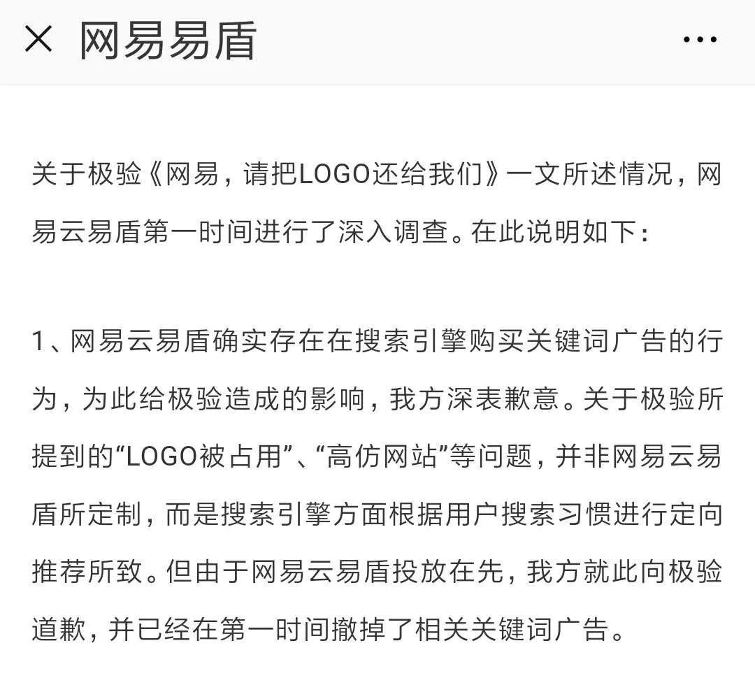 正当外界猜测不已时,网易云易盾当天在自家公众号文章《网易云易盾关于极验所述问题的致歉和说明》中承认确有购买关键词广告的行为: