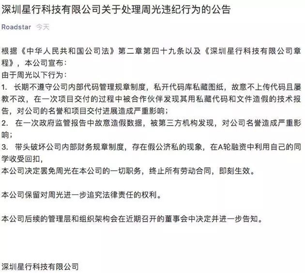 1月21日,无人驾驶公司星行科技(Roadstar.ai)发布公告称,因该公司联合创始人周光存在私开代码库、在政府监管报告中故意造假数据、利用融资收受回扣等违纪行为,公司决定罢免周光的一切公司职务。